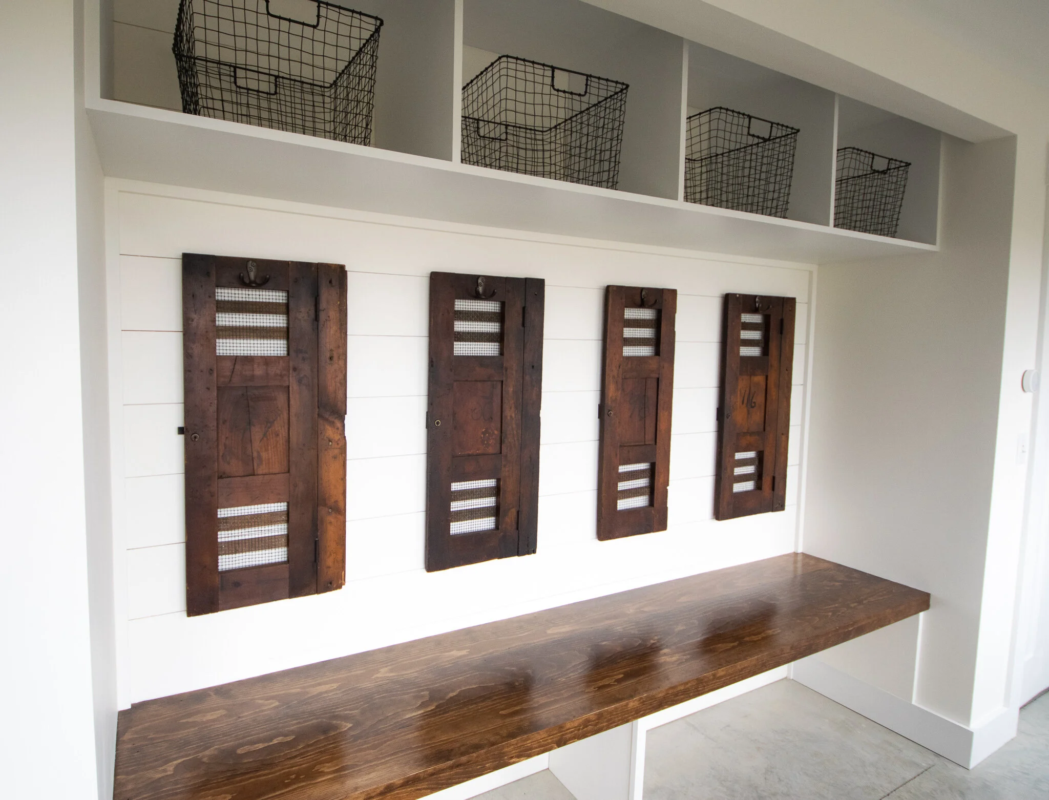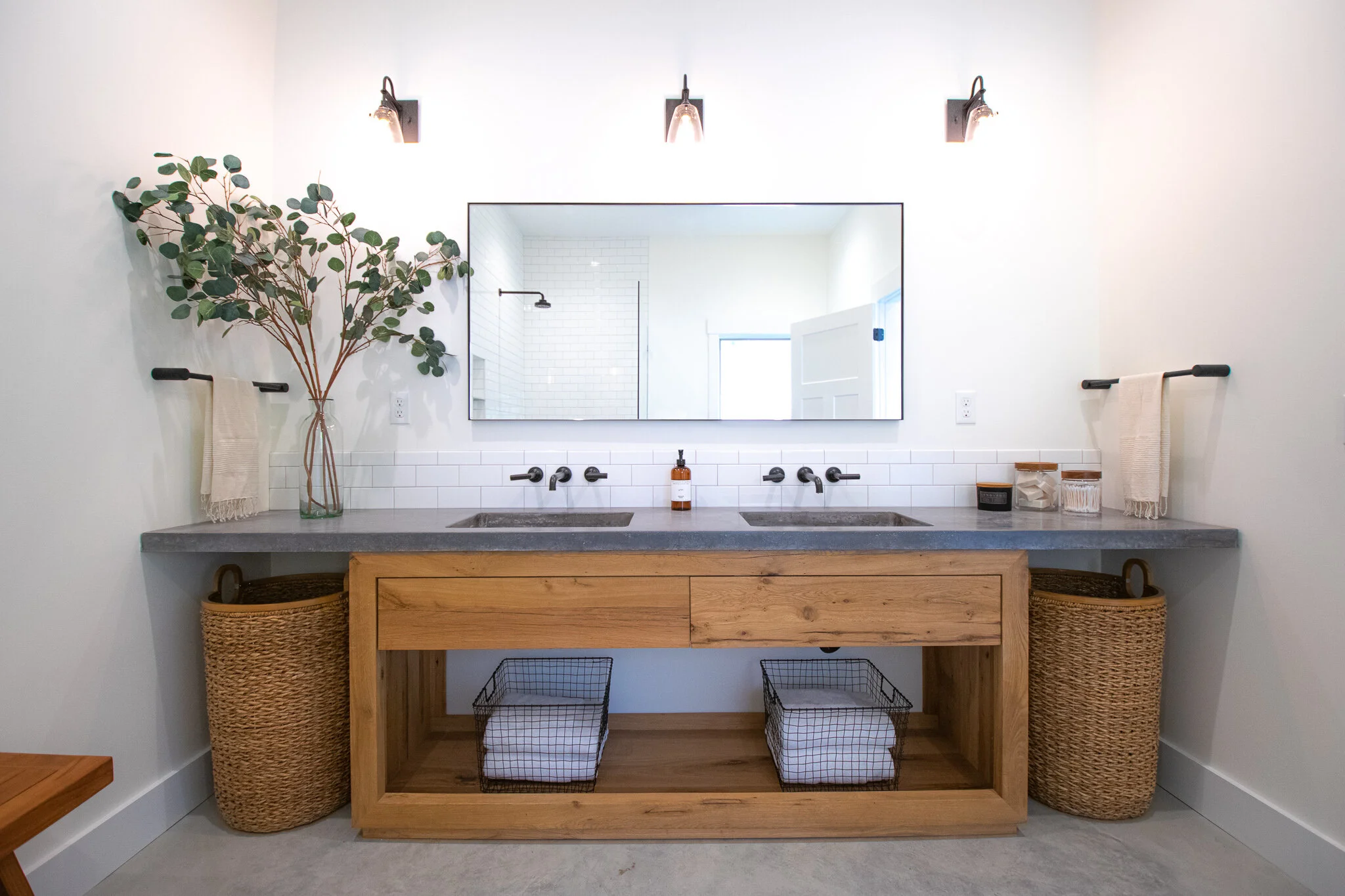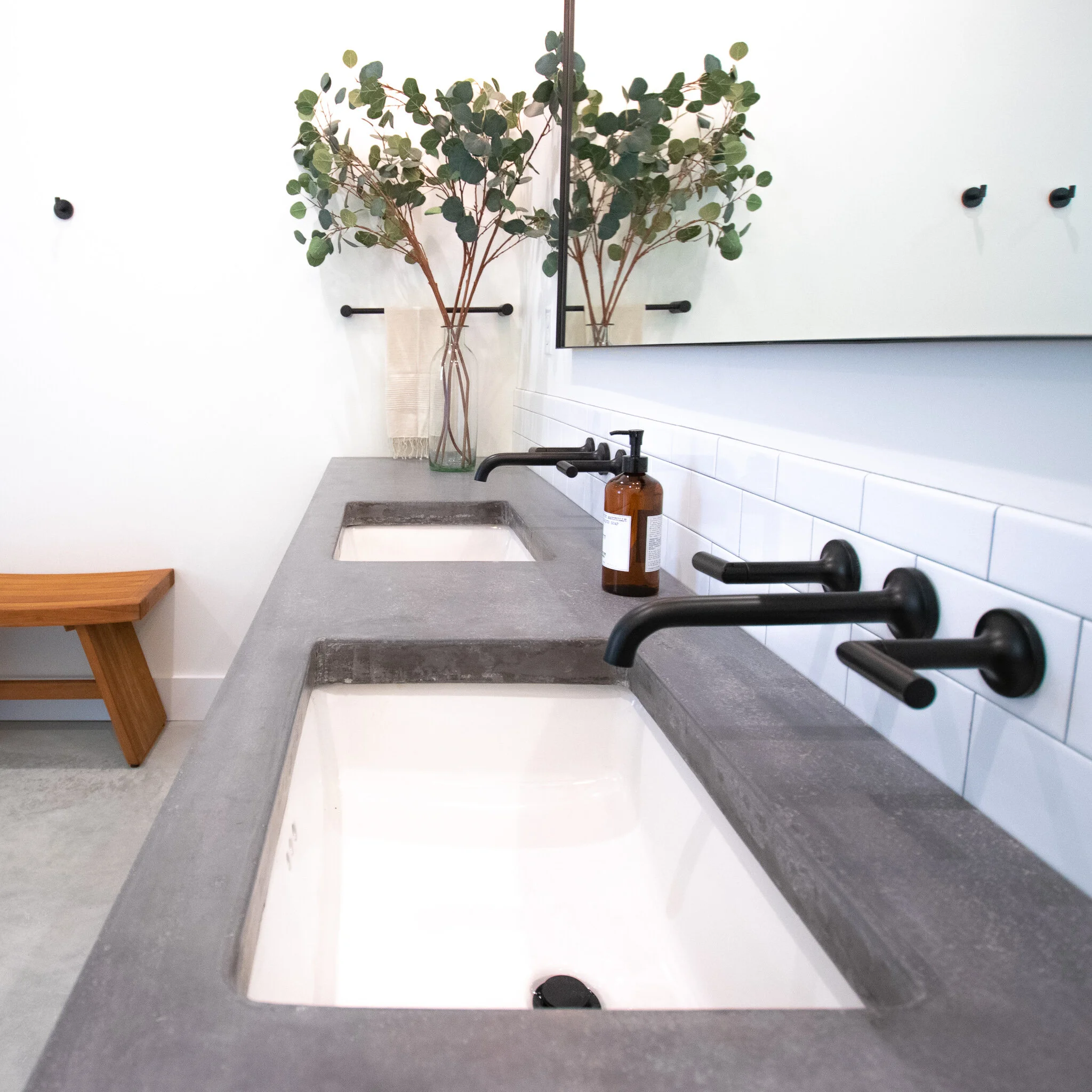 Near the Vermont & New Hampshire border, our Shadow Lake Project sits perched on a hill offering sprawling views of the White Mountains and Connecticut River in nearly every room of the house. The renovation was extensive — nearly 95% of the original house was demo’d — so the homeowners desired new construction with a forward-thinking sustainable design. The building systems focused around energy efficiency and carbon neutral technology, with the goal of Net Zero. The home boasts a 42-panel solar array, geothermal heating, radiant floors, advanced insulation, standing seam roof, and electric vehicle charging stations. On the interior, we aimed to blend clean lines, classic of a modern farmhouse, with the cozy feel of a lake house tucked away in the mountains. We mixed materials & textures, but chose cohesive paint colors throughout much of the home. The overall design centers around polished concrete, warm cedar tones, shiplap walls, well-loved antiques, and my favorite…the custom black metal staircase that leads up to the Library Room.